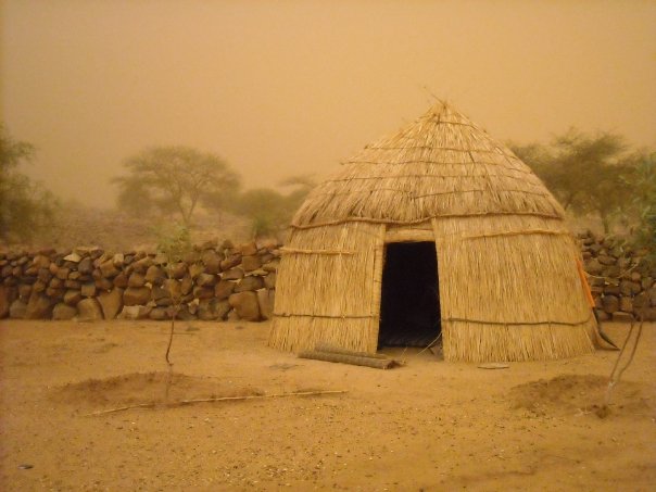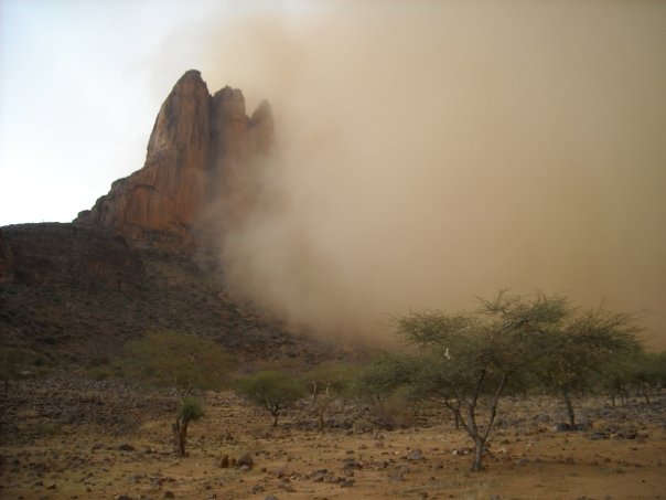 “That second morning, we were about to leave the campement we stayed at when I saw some odd looking clouds approaching. Hell’s chariot was on its way in the form of a sand storm. Imagine rolling clouds of sand thousands of feet tall engulfing huge rock spires in the distance barreling directly towards you. It’s scary and exciting, especially when your only shelter is a dried millet stock bungalow. Although Hell’s chariot never reached us, we were in for a neat treat as everything around us turned a bright yellowish-reddish-orangish hue. I don’t know how the storm missed us, but it did.”
